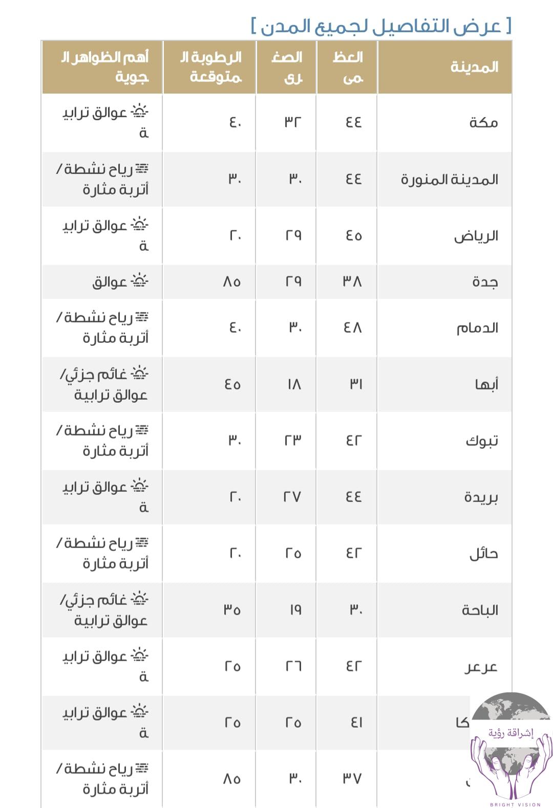 درجات الحرارة ستشهد تفاوتًا بين المناطق، حيث يُتوقع أن تسجل المناطق الشمالية والوسطى درجات حرارة معتدلة نسبيًا تتراوح بين 28 و34 درجة مئوية، بينما تصل إلى منتصف الأربعينات مئوية في المناطق الشرقية والجنوبية الشرقية والغربية نهارًا، وتنخفض نسبيًا خلال ساعات الليل.
