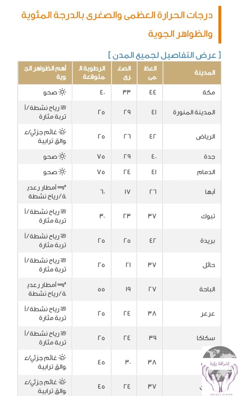 مكة المكرمة: تسود أجواء حارة في مكة المكرمة، حيث تصل درجات الحرارة العظمى إلى 44 درجة مئوية، مع سماء صافية ورياح خفيفة.