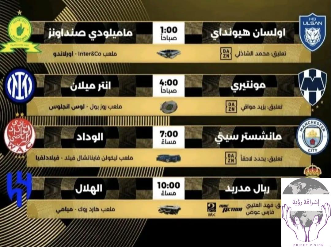 عشاق كرة القدم العالمية على موعد اليوم الأربعاء، 18 يونيو 2025، مع يوم استثنائي في منافسات كأس العالم للأندية بنسختها الجديدة التي تُقام في الولايات المتحدة. أربع مباريات قوية تجمع نخبة من أعرق الأندية في العالم، أبرزها الصدام المرتقب بين ريال مدريد الإسباني والهلال السعودي، وظهور حامل لقب دوري الأبطال مانشستر سيتي أمام الوداد المغربي. الإثارة، المتعة، والتشويق ستكون حاضرة منذ صافرة البداية وحتى صافرة الختام.
