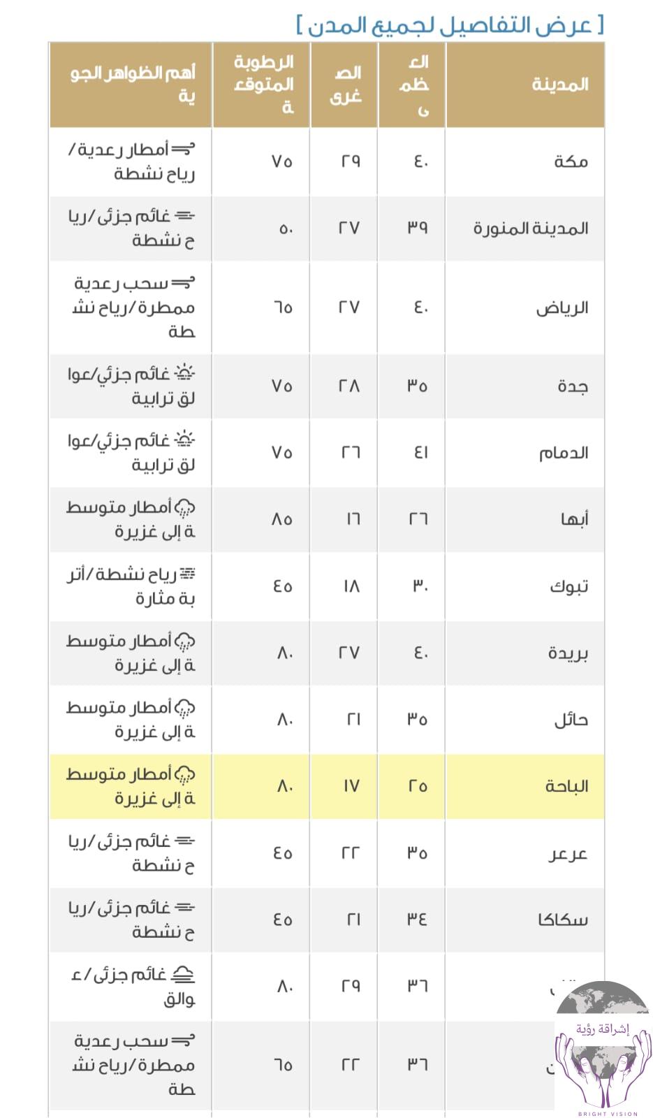 يتوقع أن تبدأ الحالة الجوية من ساعات الصباح الأولى، حيث تكون السماء غائمة جزئيًا إلى غائمة على أغلب مناطق الجنوب والغرب، مع تشكل السحب الركامية الممطرة على مرتفعات جازان، عسير، الباحة وتمتد نحو أجزاء من مكة المكرمة والطائف. وتشير التوقعات إلى احتمالية هطول أمطار متوسطة إلى غزيرة في بعض الفترات، يصحبها نشاط في الرياح السطحية وزخات من البرد، مع خطر جريان السيول في المناطق الجبلية والمنحدرات.